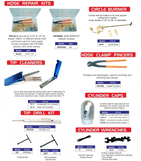 Cylinder Caps, Tip Cleaner, Cable Cutter, Gas Flow Tester, Wire Brushes, Bastard File